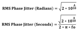 La première équation calcule la gigue RMS en radians à partir du bruit de phase intégré A (dBc). On convertit d’abord A en valeur linéaire à l’aide de 10^(A/10), puis on multiplie par 2 et on en prend la racine carrée pour obtenir la déviation angulaire moyenne.