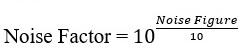 La figure de bruit NF, donnée en dB, est convertie en facteur de bruit F linéaire en utilisant la base 10. Cette transformation permet de passer d’une échelle logarithmique à une échelle linéaire, ce qui est utile pour les calculs de systèmes en cascade ou les analyses de gain et de bruit global.