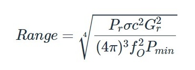 R = ((Pt × σ × c² × G²) / ((4 × π)³ × f₀² × Pmin))^(1/4)