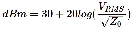 dBm = 10 × log10(P(W) × 1000) = 20 × log10(Vrms) + 30 − 10 × log10(R)