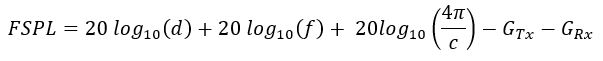 FSPL(dB) = 20 × log 10 (d) + 20 × log 10 (f) + 92,45 – G Tx – G Rx